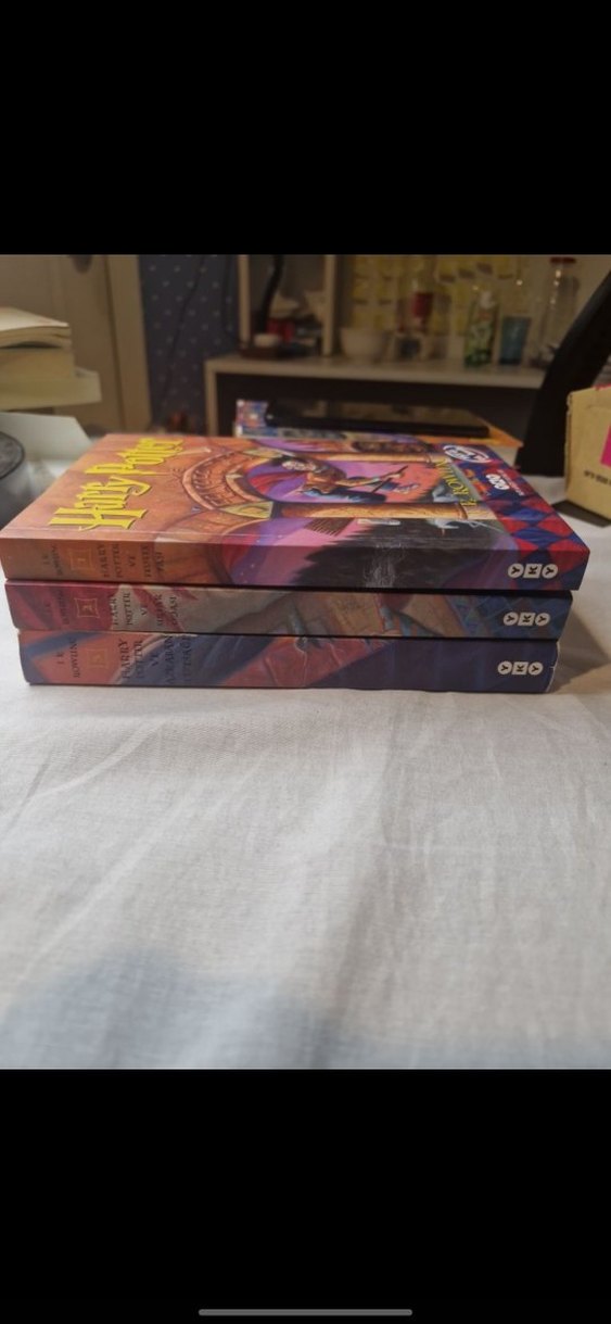 Renkli kapaklara sahip üç Harry Potter kitabı seti, orijinal OVO logosu sırtlarda yer alıyor. Fantastik kitap severler için.