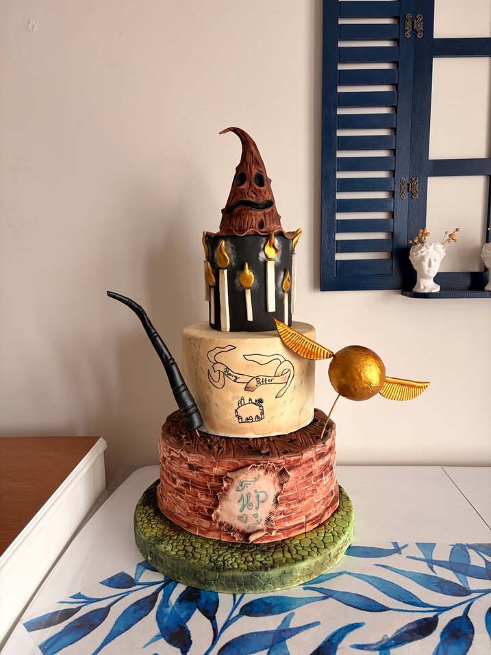 Harry Potter konseptinde şeker hamurundan maket pasta. 65 cm boyunda büyük ebattadır. Beşiktaş Sait Çiftçi Devlet Hastanesi yakını elden teslim edilir. Seçmen şapka, altın snitch ve asa detaylarıyla harika bir tasarıma sahip. ✨