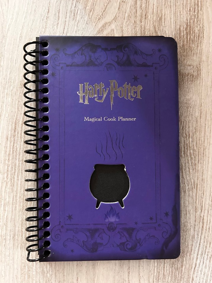 Harry Potter temalı mor kapaklı, spiral ciltli ve "Magical Cook Planner" yazılı planlayıcı defter. ♂️
