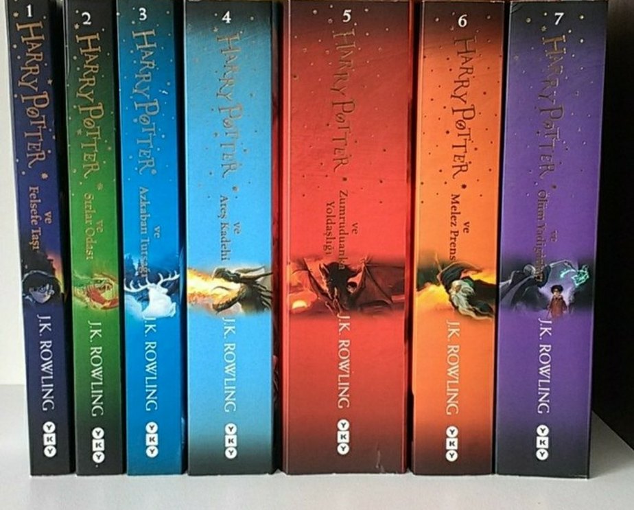 J.K. Rowling'in Harry Potter serisi kitapları, renkli sırt tasarımları ve YKY yayınevi etiketiyle.
