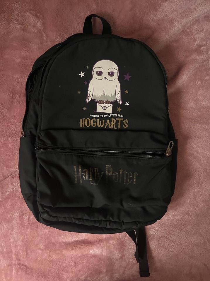 Siyah çocuk okul çantasında Harry Potter teması, baykuş resmi ve "HOGWARTS" yazısı bulunur. Önünde fermuarlı cep ve üst tutma sapı vardır.