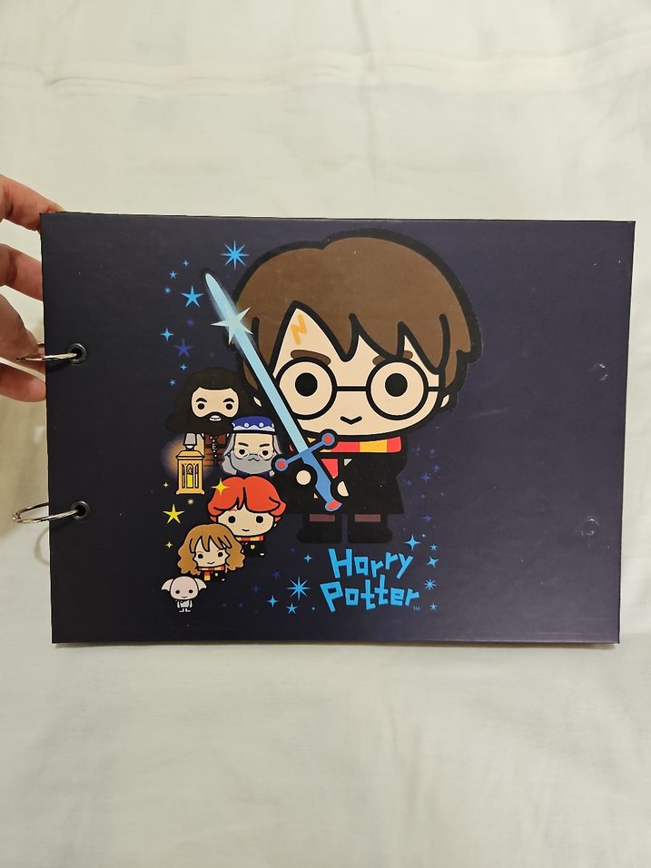 Harry Potter karakterlerinden esinlenen sevimli çizgi film illüstrasyonları içeren, metal halkalarla ciltlenmiş bir fotograf albumu