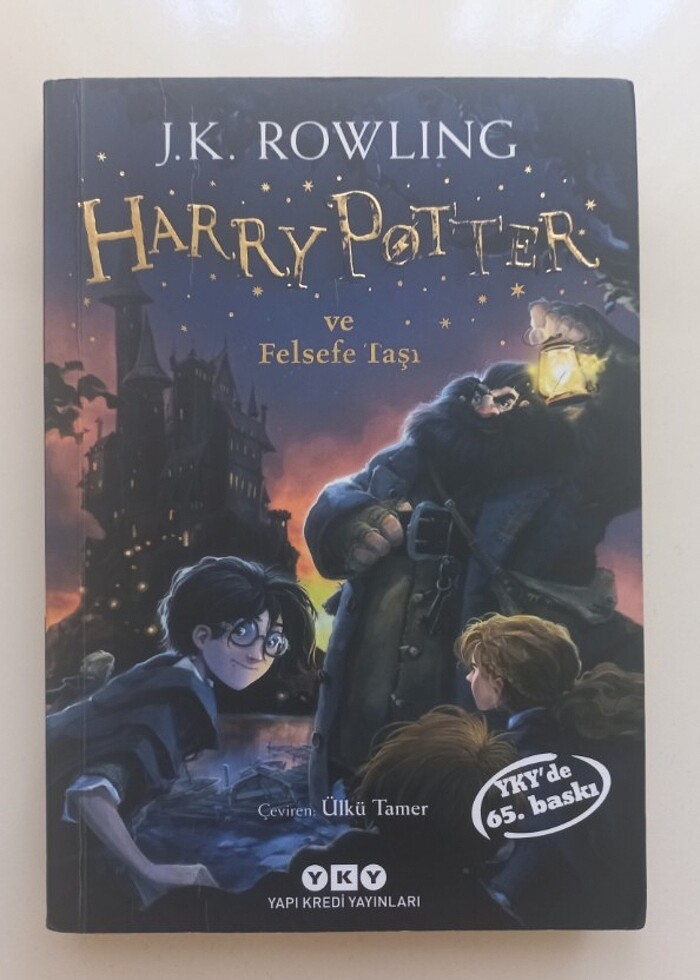 "Harry, elleri titreyerek zarfı çevirince mor balmumundan bir mühür gördü; bir arma - koca bir "H" harfinin çevresinde bir aslan, bir kartal, bir porsuk, bir de yılan." Yazarı: J.K. ROWLING 272 Sayfa Kitabın ön kapağında Harry Potter yazan yer biraz silinmiş. Fotoğraf olarak ekledim.