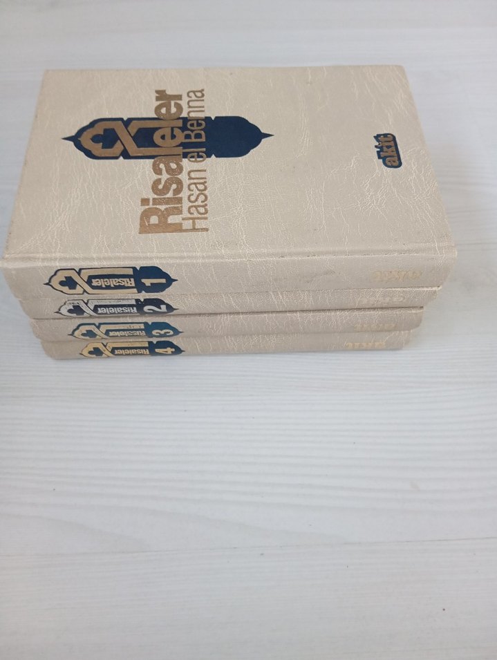 Hasan el-Benna'nın Risaleler adlı 4 ciltlik seti, bej kapaklı üniversite kitabı seti.
