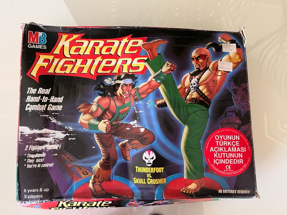 Karate Fighters serisinden Thunderfoot ve Skull Crusher; 1994 yılından kalma Hasbro Karate Fighters oyunu, Koleksiyonluk. Gerçekçi el ele dövüş oyunu. Kullanım kılavuzu ile birlikte, Orjinal kutusunda. Antika ve koleksiyonluk. Ringe girin, en cesur ve en iyilerle karşılaşmaya hazırlanın! Karate Fighters, aksiyonu sizin kontrol ettiğiniz bir oyun. Dövüşe başlarken, yakın dövüş üssünüzü olabildiğince sıkı kavrayın! Kısa hareketler yumruklar, geniş dönüşler uçan tekmeler için Kontrol kadranını sola ve sağa çevirin. Dövüşçünüzü canlandıran dönen plakalar mevcuttur. Beceri, hız ve rakibinizin göğsüne isabetli bir vuruş onu sersemletecek ve size raundu kazandıracak! Puanları özel işaretleyici üzerinde takip edin. Beş puana ilk ulaşan Büyük Usta olur!