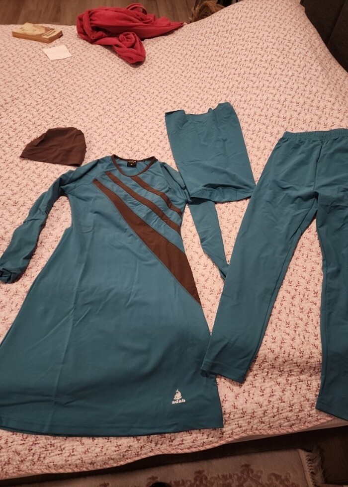 Sadece 1 defa kullandım. Dar geldiği için satıyorum. 4 parça. Üst kısmında içine dikili büstiyeri var