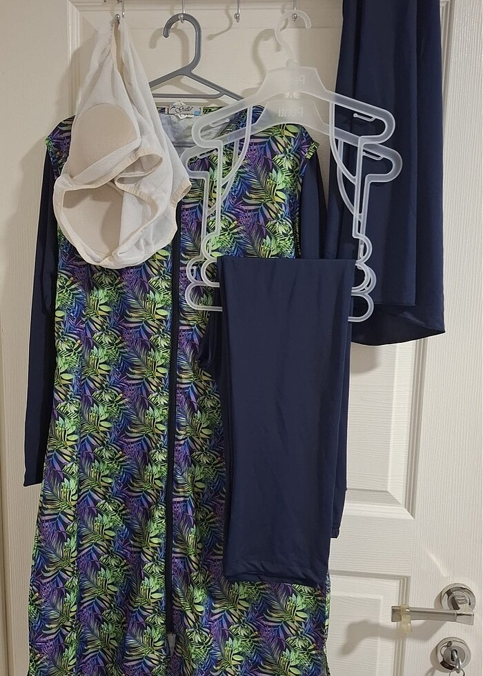 S beden ama m bedene de olur geniş kesim. 1 kere kullanıldı yeni gibi. Tunik pantolon başörtü ve üst iç giyim olmak üzere 4 parçadır.