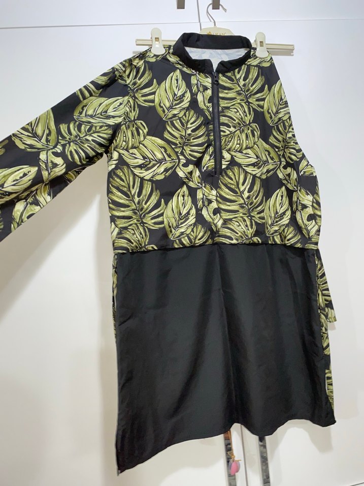 HAŞEMA alt üst takım yüksek yakalı Üst kısmı canlı yaprak desenli, alt kısmı koyu renklidir ve önünde fermuar bulunur.