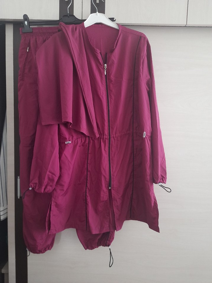 mürdüm renkli, uzun ve rahat kesim , fermuarlı,bağcık detaylara sahip, şu itici kumaştan üretilmiştir.iki koltuk arası 55cm üst boy 85cm alt boy 100cmdir.kapalı bonesi️ vardır.sadece 1 kez giyildi.