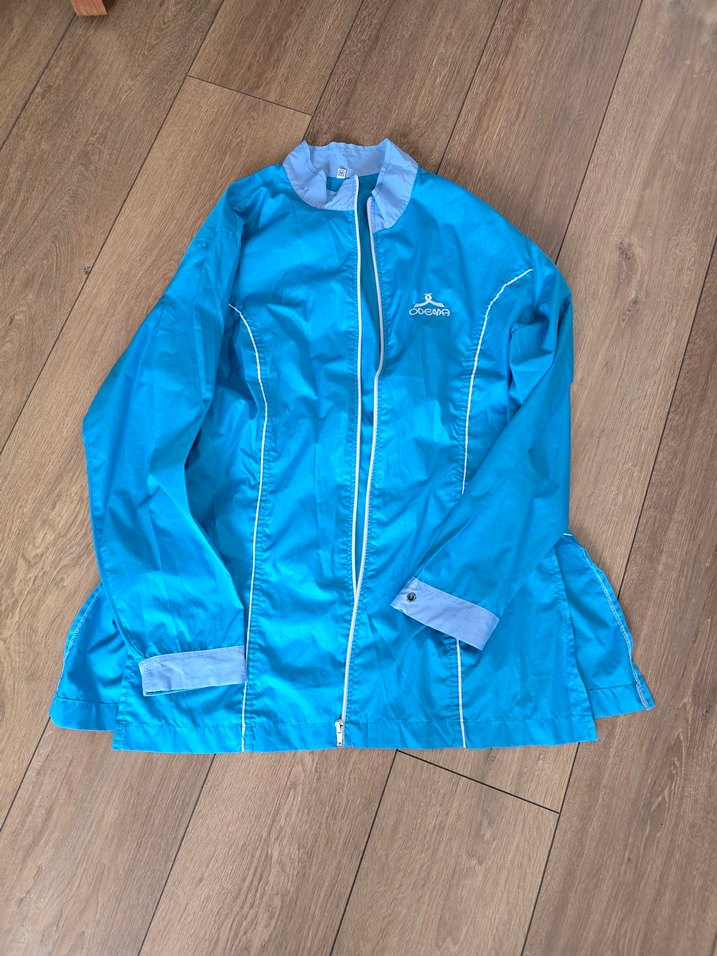 Fermuarlı, uzun kollu ve yakalı mavi kadın ceket. Parlak renk alt üst odema marka haşema