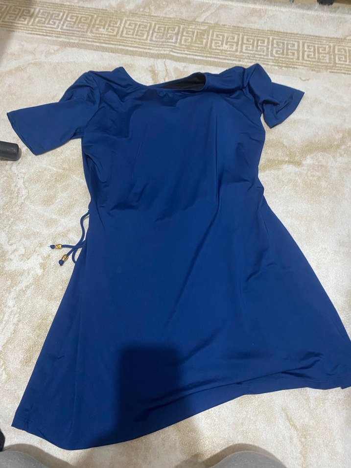 Koyu mavi renkte, kısa kollu ve drapeli hamile tunik. Tek renk, midi boyda, tekne yaka ve sentetik kumaştan yapılmıştır.