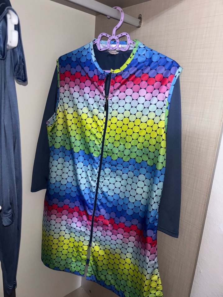 Renkli,içinde uzun kollusu var,üstüne renkli yelek belden sıkmalı,altına uzun eşofmanı var, bone ve boyuna kapatmak içinde kumaşı var