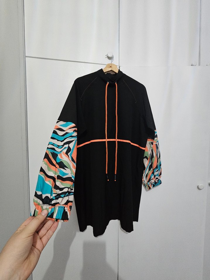 XL beden siyah renk desenli kollar yalnızca 1 kez giyildi pantolon beli ve bileği lastikli tunik sırttan fermuarlı ürünün bonesi de mevcuttur