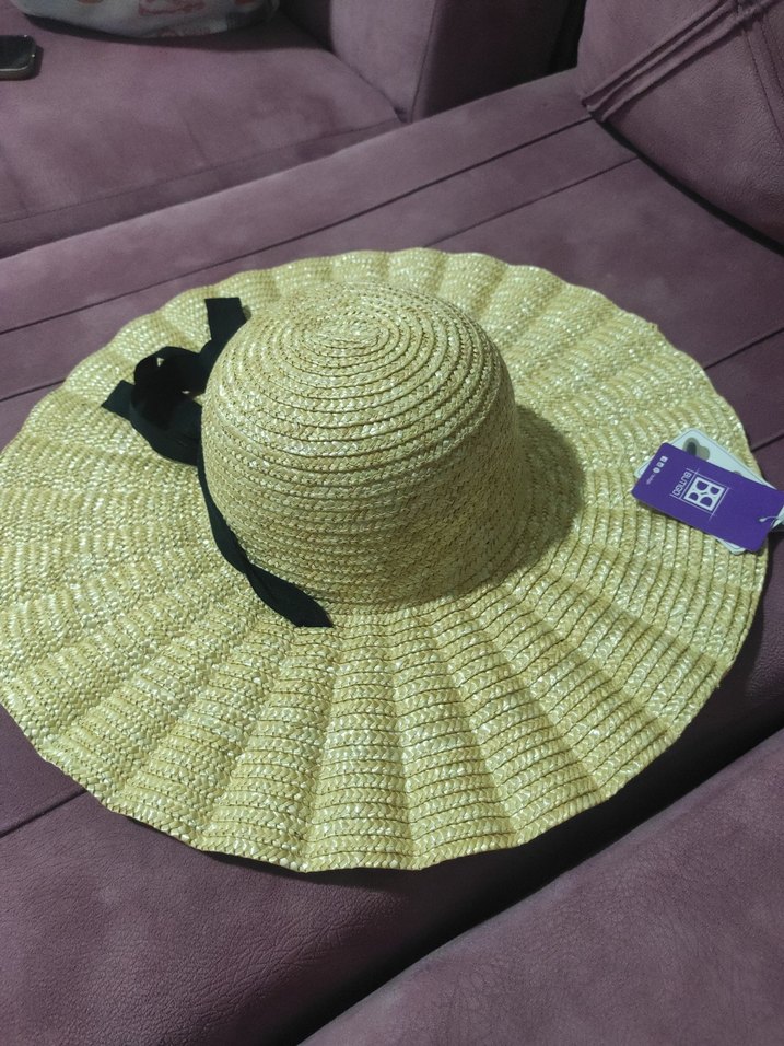 fırfırlı tasarıma sahip kadın şapka. Siyah kurdele detaylı, bohem ve retro tarzda hasir kumaştan yapılmış ...