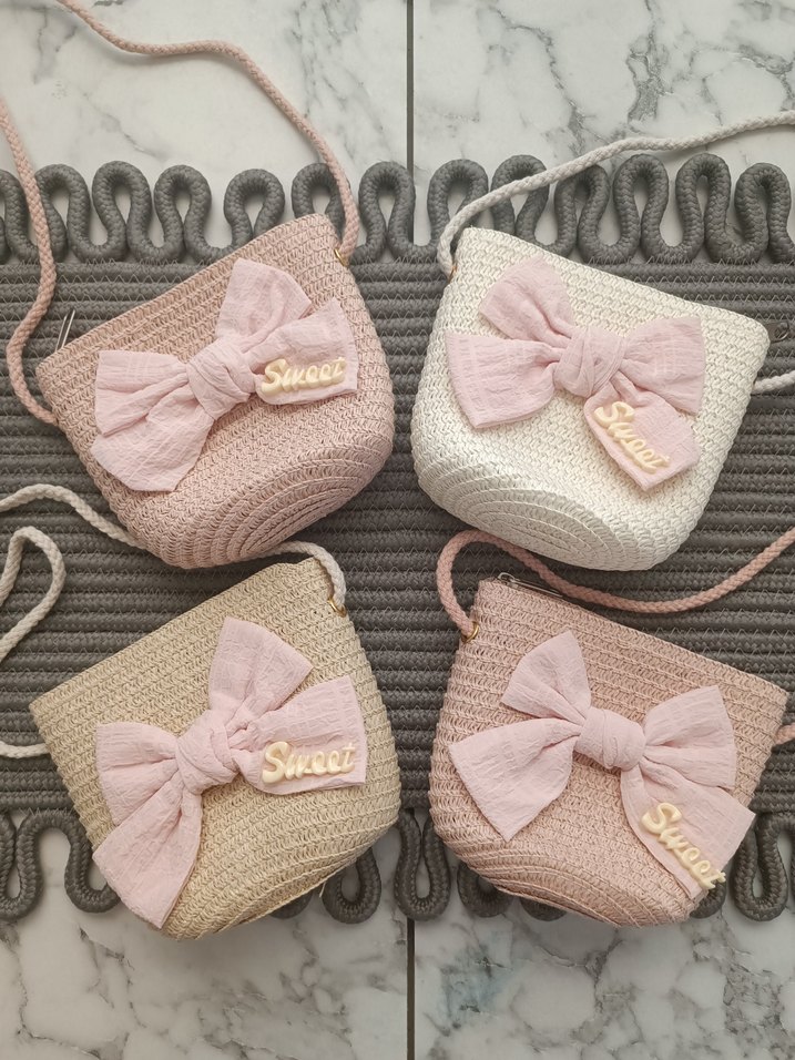 Nakışlı desenli, pastel renkli örgü kadın çantaları, büyük fiyonk ve 'Sweet' etiketi ile günlük kullanıma uygun.