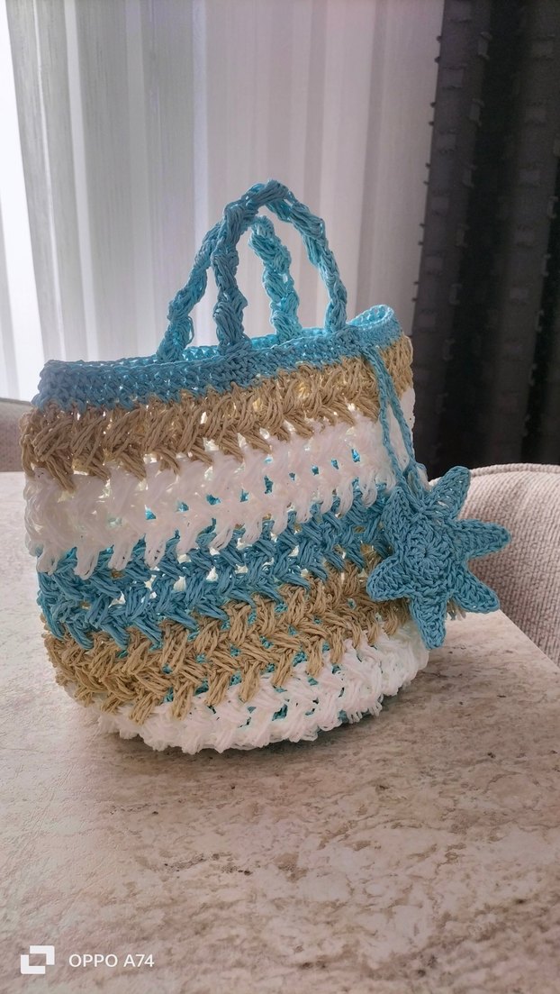 Mavi pastel tonlarda, dantel detaylı örgü bohem tarz kadın çanta. Rahat ve desensiz tasarıma sahip, yıldız şeklinde süsü bulunur.