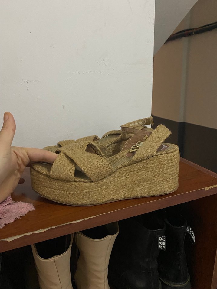 Bej renkli, tokalı kayışa sahip, bohem tarzda, kauçuk malzemeden yapılmış dolgu topuklu ayakkabı. Hafif ve desensiz, günlük kullanıma uygun.