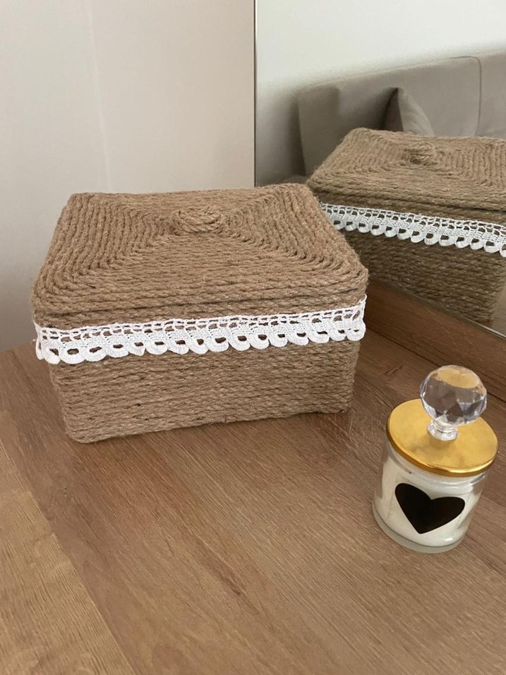 Beyaz dantel süslemeli, doğal görünümlü hasır saklama kutusu. Kapaklı dolap içi düzenleyici organizer marka temsilidir