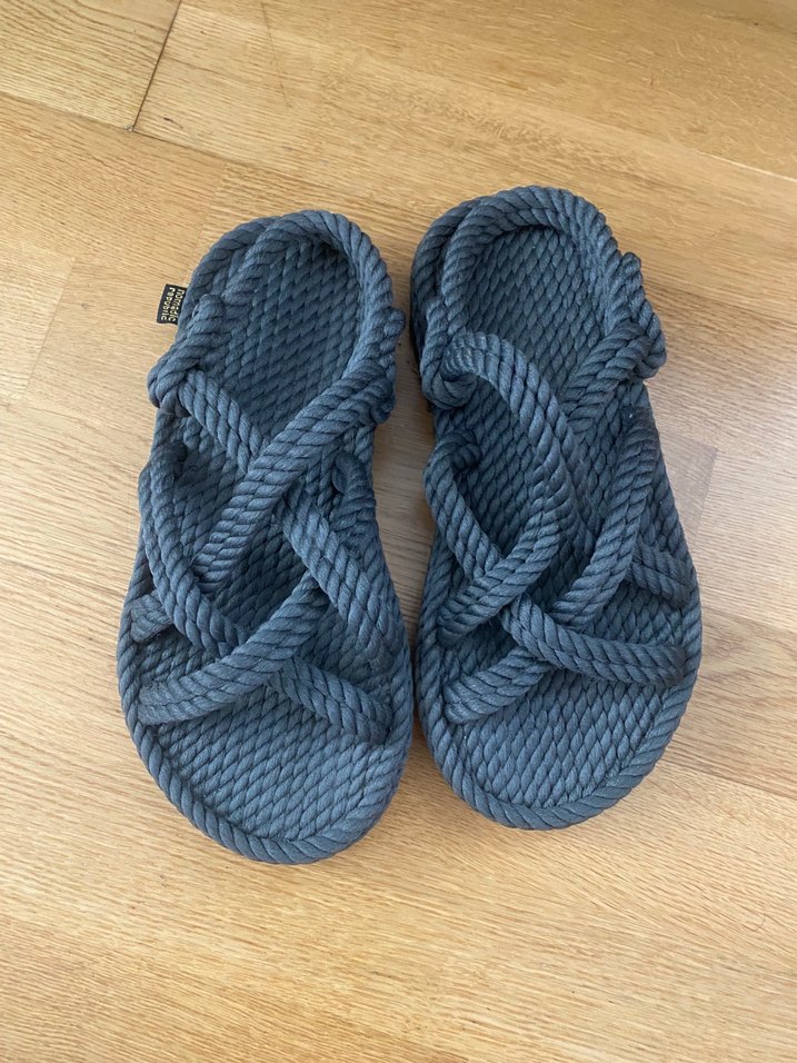 Gri renkte, örgülü tasarıma ve dolgu topuğa sahip kadın sandaletleri. Orijinal nomadic republic. Birkaç kez giyildi. Numarası 39 ama 38 giyene olur