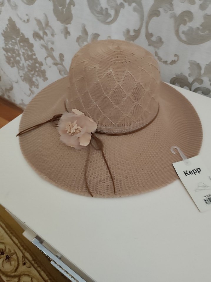 Bej renk, geniş kenarlı ve çiçek detaylı örgü kadın şapka. Yumuşak dokulu ve bohem tarzda. Marka: Kepp.