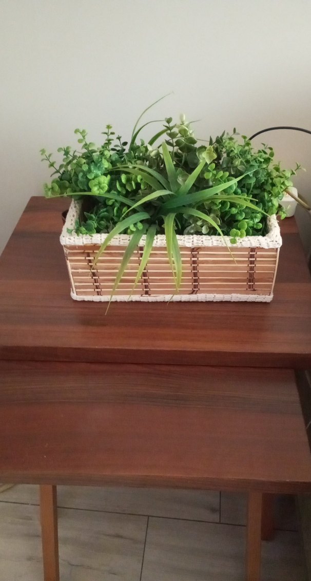 Hasır kutu içinde canlı görünümlü yeşil yapay bitkiler, mekana doğal bir dokunuş katmak için idealdir.