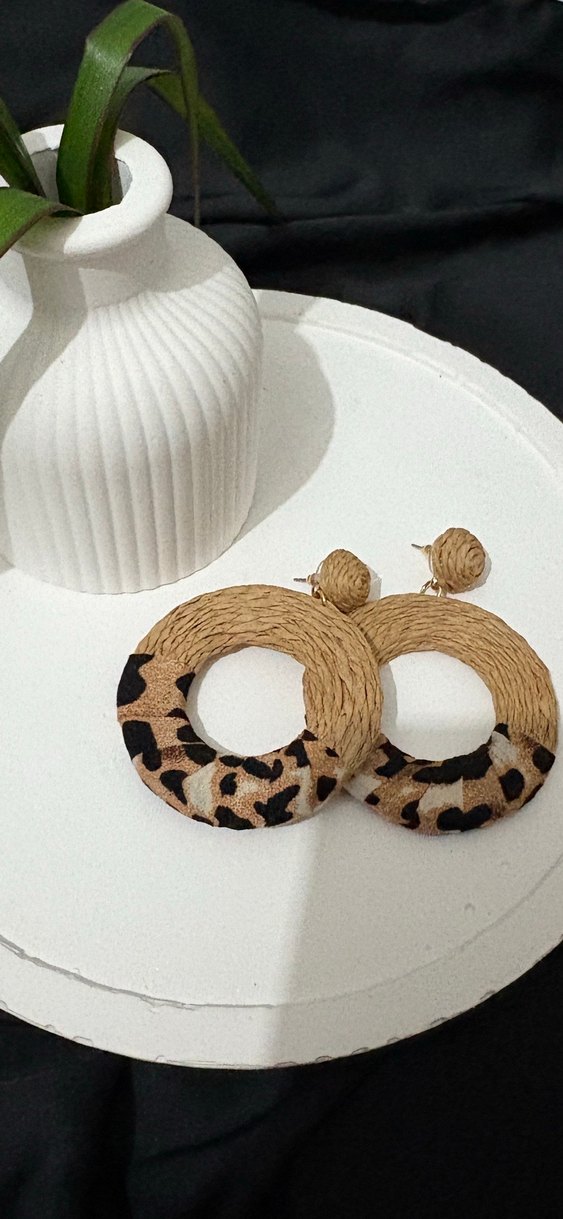 hasır, kahverengi leopar desenli uzun küpeler, günlük kullanım için uygun.