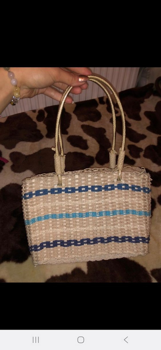 hasır örgülü, açık mavi örgü kumaştan bohem tarzda kadın çantası, günlük kullanıma uygun.marka temsilidir