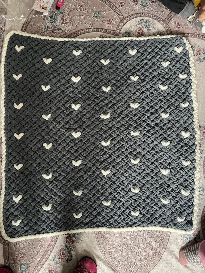 Gri renkte, küçük beyaz kalp desenli kalın dokuma örgü bebek battaniyesi. Yumuşak ve rahat yapıda. Yaklaşık olarak ölçüsü 90x90 dır. Tamamen el emeğidir. Kız erkek olarak kullanılabilir