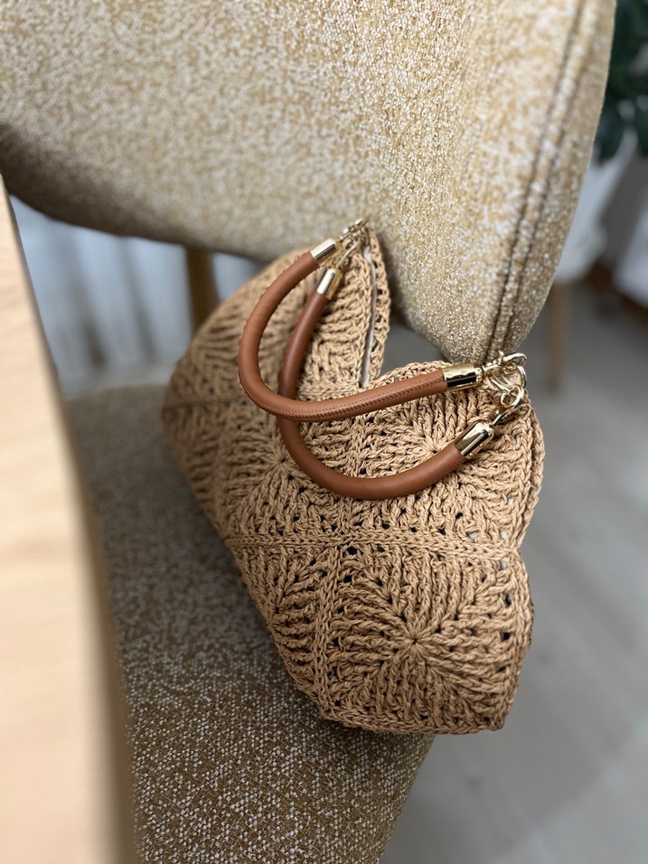 Hasır renkte, nakışlı desenli ve dantel detaylı örgü kadın çanta. Kahverengi saplara sahip, her tarza uygunluk sağlayan ister şık ister günlük çanta.