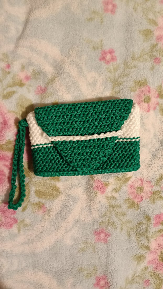 Yeşil ve beyaz renklerde, hasır örgü bilek askılı günlük kullanıma uygun, rahat ve bohem tarzda kadın el çantası. el yapımı.