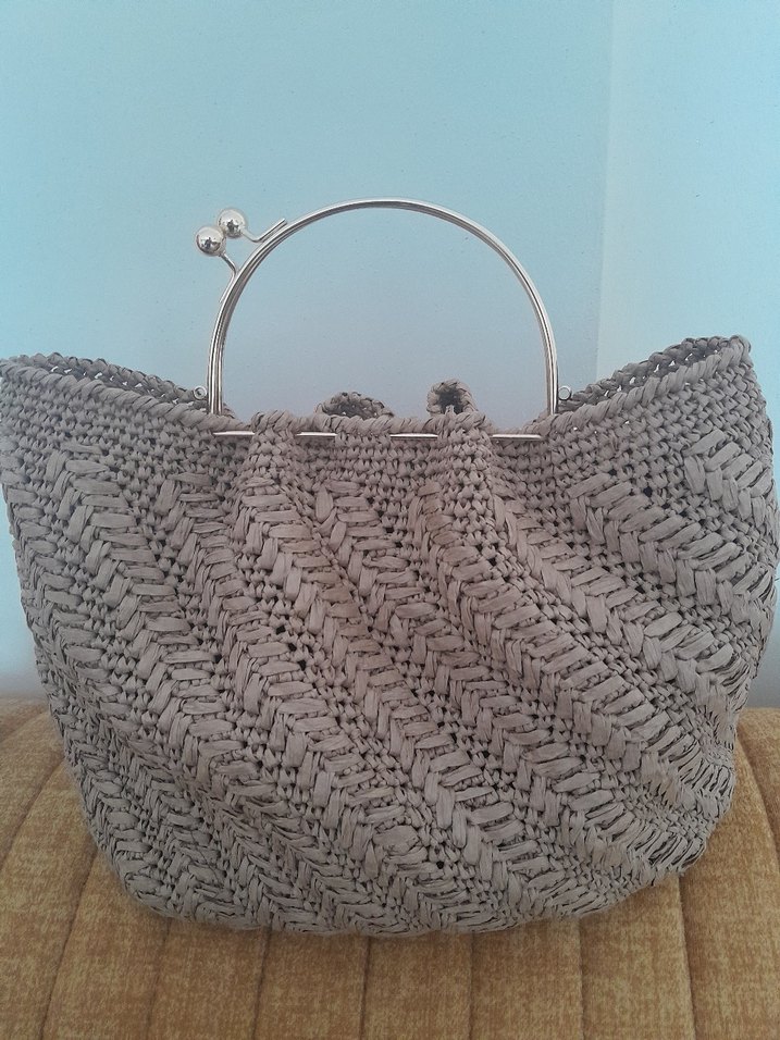 hasir örgü kagit ipten yapılmış, metal saplı bohem tarzı kadın çantasıdır. Günlük kullanıma uygundur ve minimalist bir görünüm sunar.