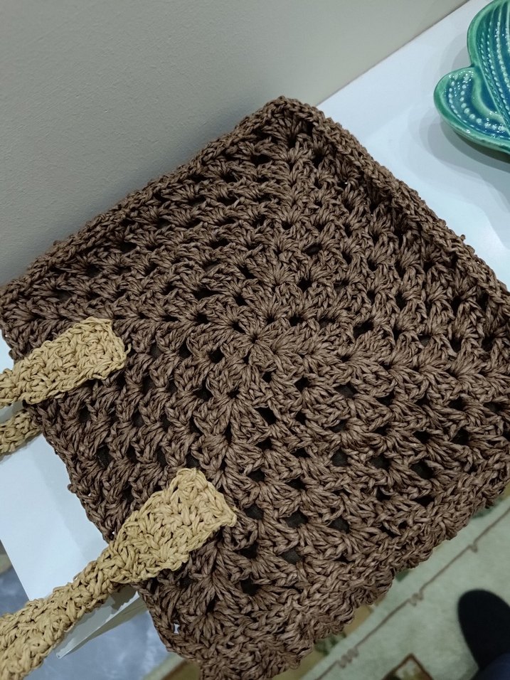 Kahverengi örgü kumaştan, bej saplı, günlük kullanıma uygun bohem tarzda kadın çantası.Ölçüleri En 21 boy 21.Çantanın sapı 13 cm.