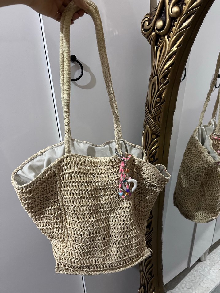 Hafif bej renkte, nakış detaylı örgü bohem tarzda uzun saplı kadın çantası. Günlük kullanım için uygundur.