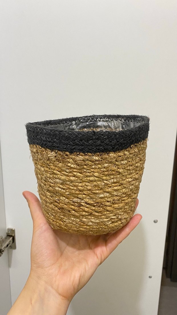 Kahverengi ve siyah kenarlı küçük örgü sepet, depolama ve düzenleme için uygundur.