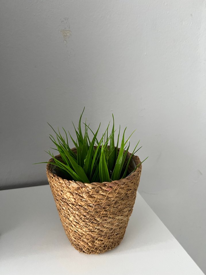 Hasır saksıda yapay yeşil bitki, mekanınıza doğal bir dokunuş katıyor.