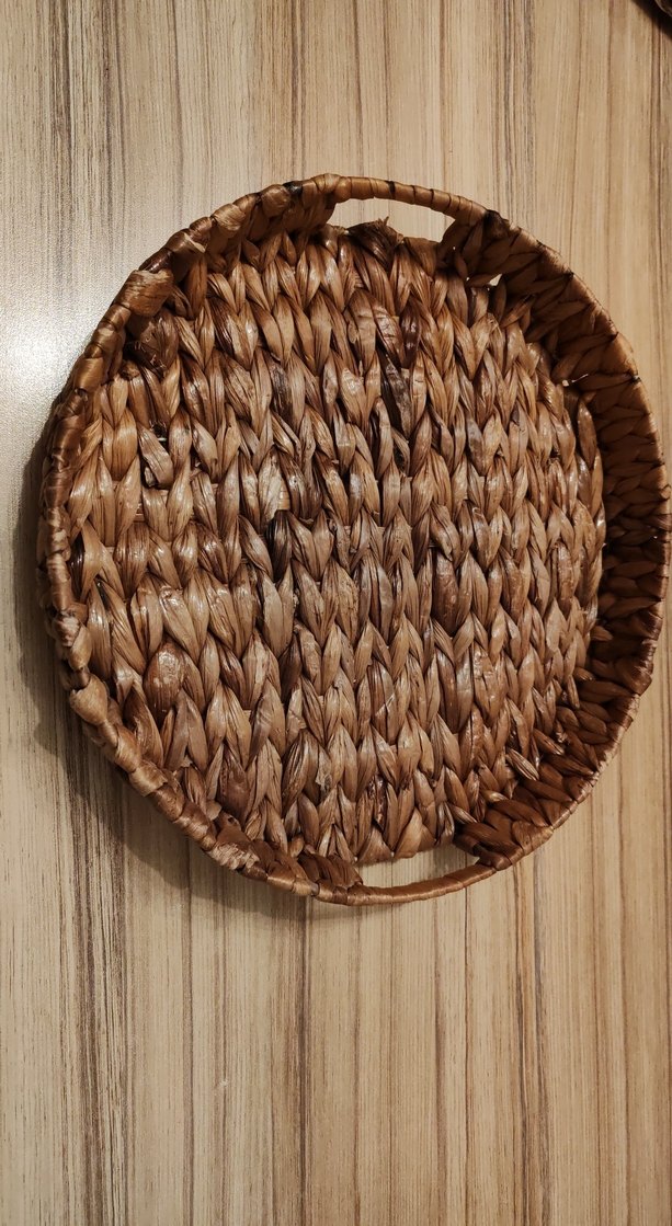 Parlak kahverengi dokuma hasır sepet tepsi yuvarlak şekilli ve sağlam saplıdır, servis, düzenleme ve sunum için uygundur. Hiç kullanılmadı.