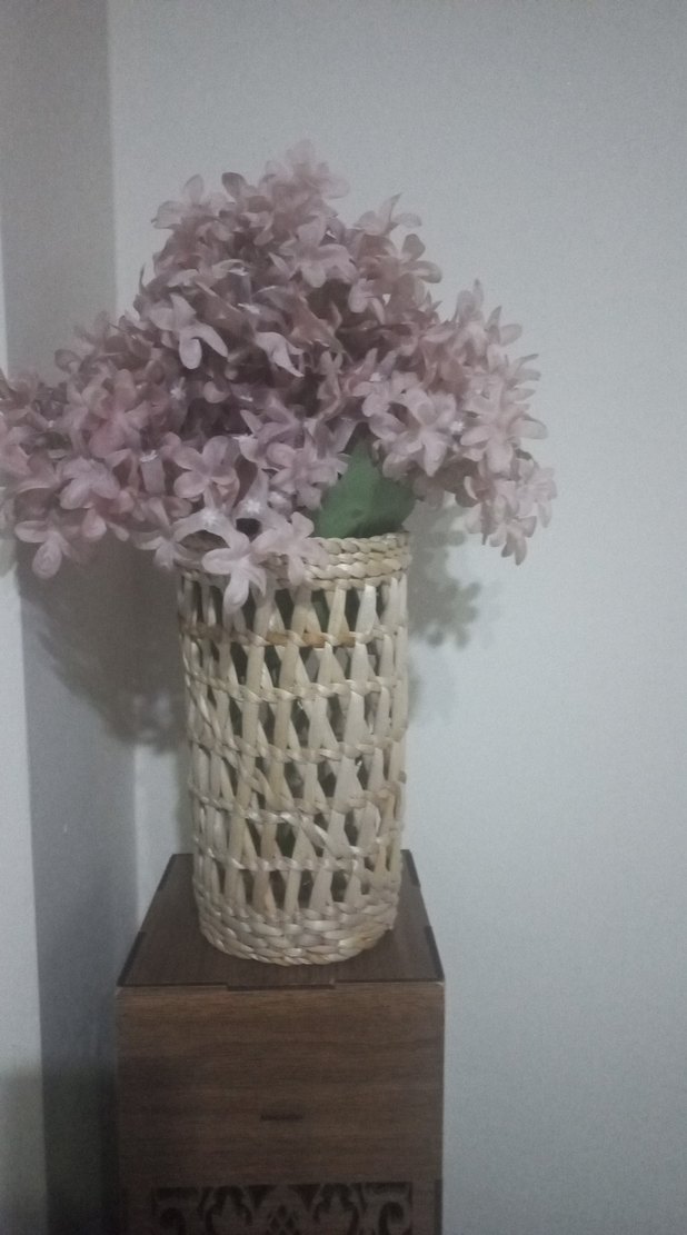 Doğal hasır tasarımlı bej vazo, çiçek sergilemek için uygundur.