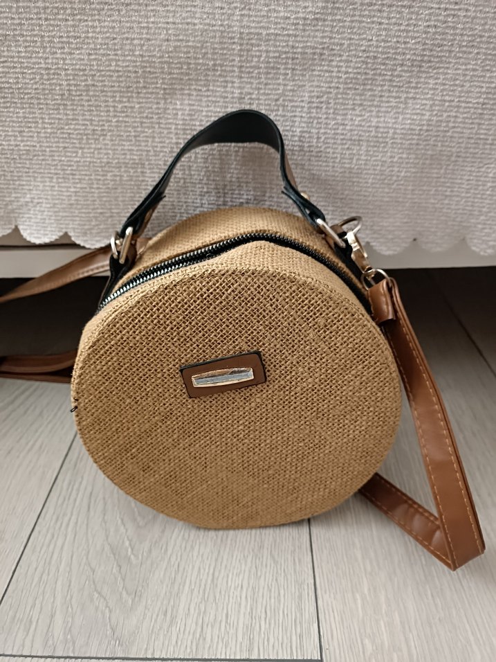 Kahverengi, hasır nakışlı detaylara sahip yuvarlak kadın çantası. Sentetik kumaştan, kemerli tasarımlı ve günlük kullanıma uygun bohem tarzda.