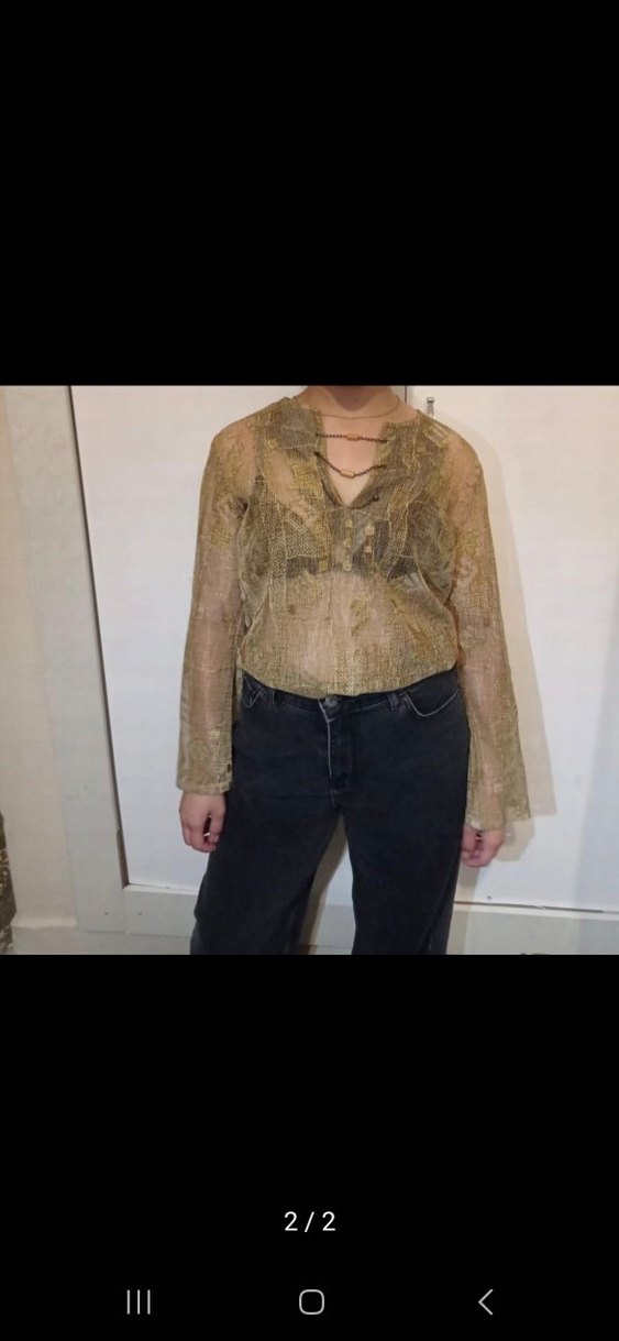 Bej renkli, parlak yılan desenli ve dantel detaylı, keten kumaştan üretilmiş, V yakalı ve uzun kollu bol kesim bluz. Ofis kullanımı için uygundur.