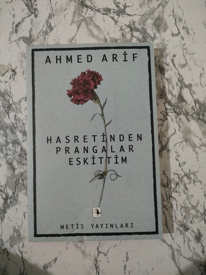 Ahmed Arif'in Metis Yayınları'ndan çıkan "Hasretinden Prangalar Eskittim" adlı şiir kitabı, kapakta yer alan çiçekle duygusal şiirler içerir.