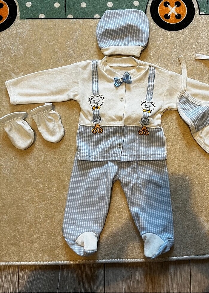 Şapka, eldiven, önlük ve alt-üst kıyafeti ile toplam 5 parçadan oluşmaktadır. Hastaneden çıkarken sadece foto çekiminde kullanıldı. En ufak sorunu yoktur. #yenidoğanhastaneçıkışı