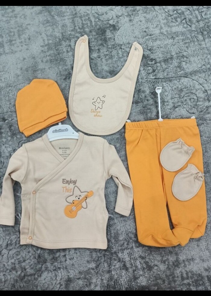 Yeni ve etiketli yüzde yüz pamuklu 5 li set hastane cikisi