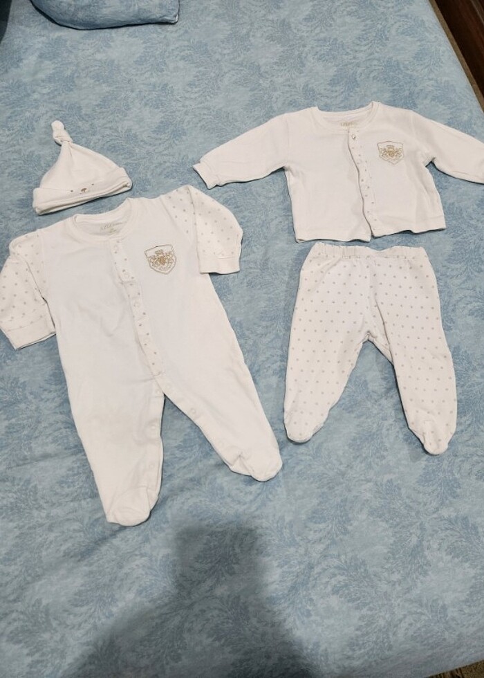Tulum 2 kez giyildi. Takım birkaç kez giyildi. Yakalarında beklemeye bağlı hafif sararma vardır. Pijama üstünde de çıt çıtında soyulma vardır. Alt pijamasının belinde lastik söküğü vardir fotoda belirttim. Unisex ürün. Aziz bebe.