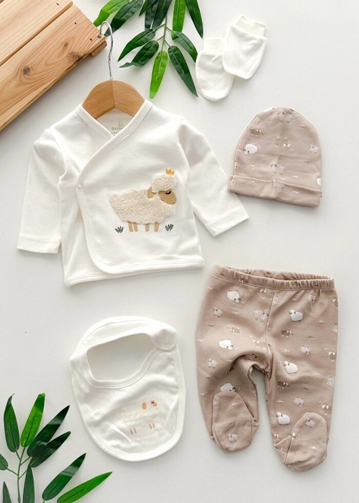 Minik tüylü kuzucuk nakışlı yandan çıtçıtlı mevsimlik yenidoğan 5li set Hem Kız Hem Erkek bebekelr için İdeal 0 pamuk