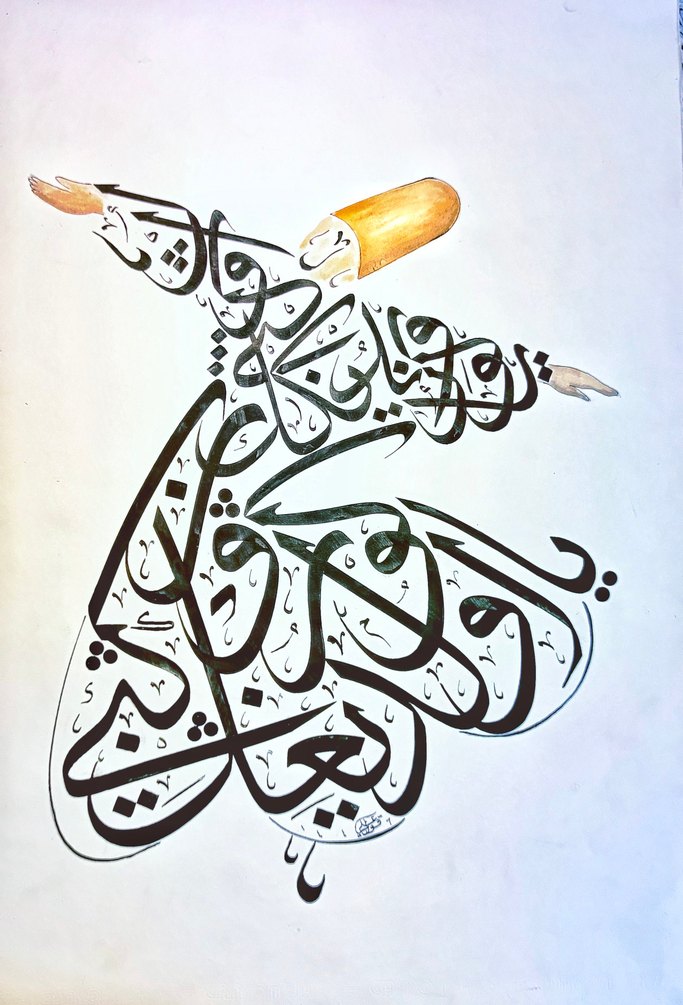 Renkli hat sanatıyla oluşturulmuş, dönen derviş figürü içeren tablo. orjinal el çekme hat tablosu. " ya olduğun gibi Görün, yada göründüğün gibi ol" hat ketebe kulali