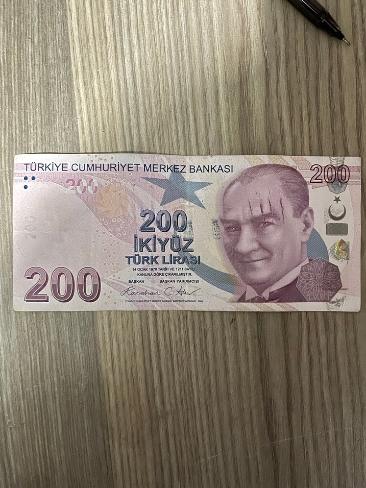 Türkiye Cumhuriyet Merkez Bankası tarafından basılmış 200 Türk Lirası banknotu Atatürk resminde çizik mevcut