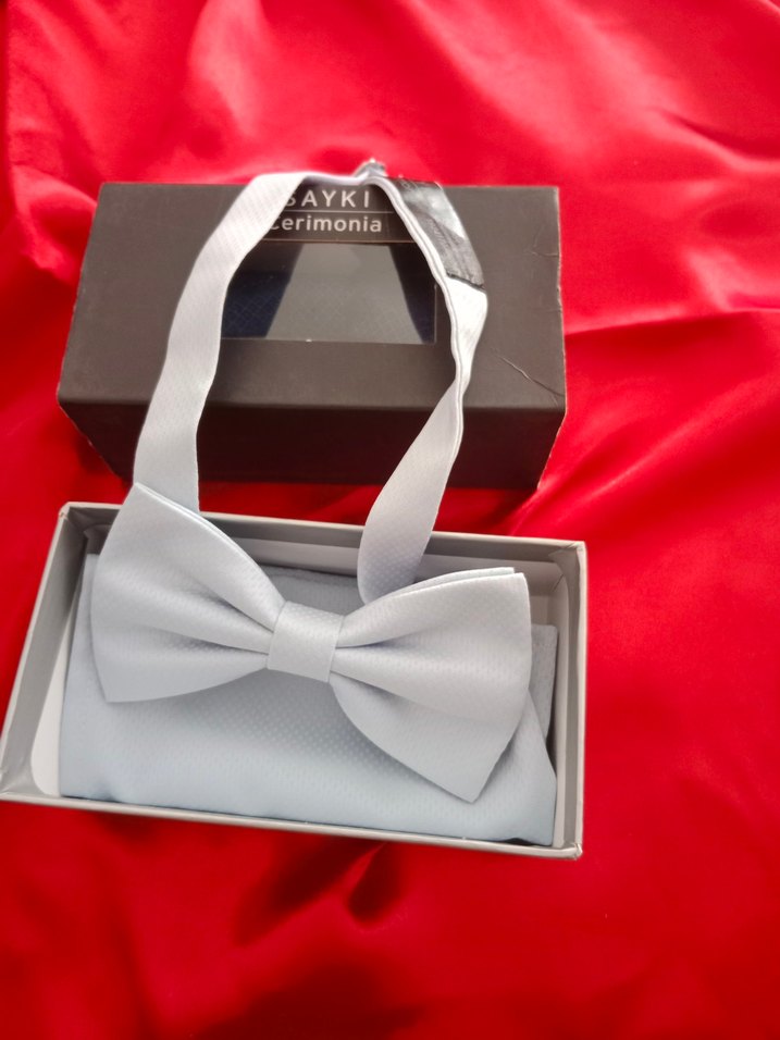 Hatemoglu markalı beyaz erkek papyon, modern klasik tarzda, desen içermeyen pürüzsüz kumaştan. Aynı renkte mendille kutuda sunulur.