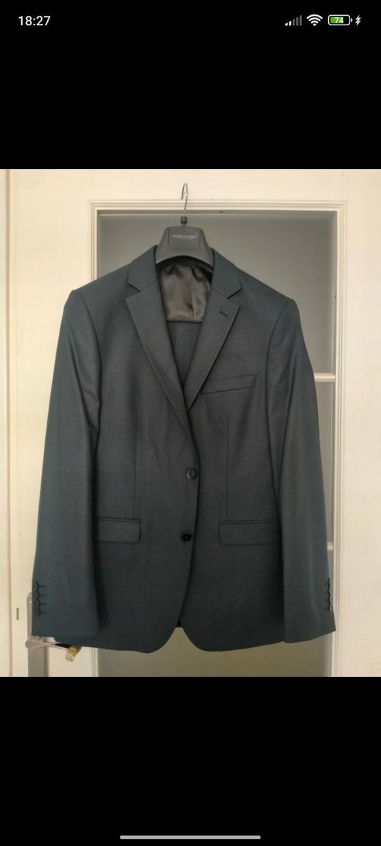 Gri renkli, düğmeli ve keskin yaka detaylı erkek takım elbise. Uzun kollu ve normal kesim, ofis için uygun klasik ve çağdaş tarzda.