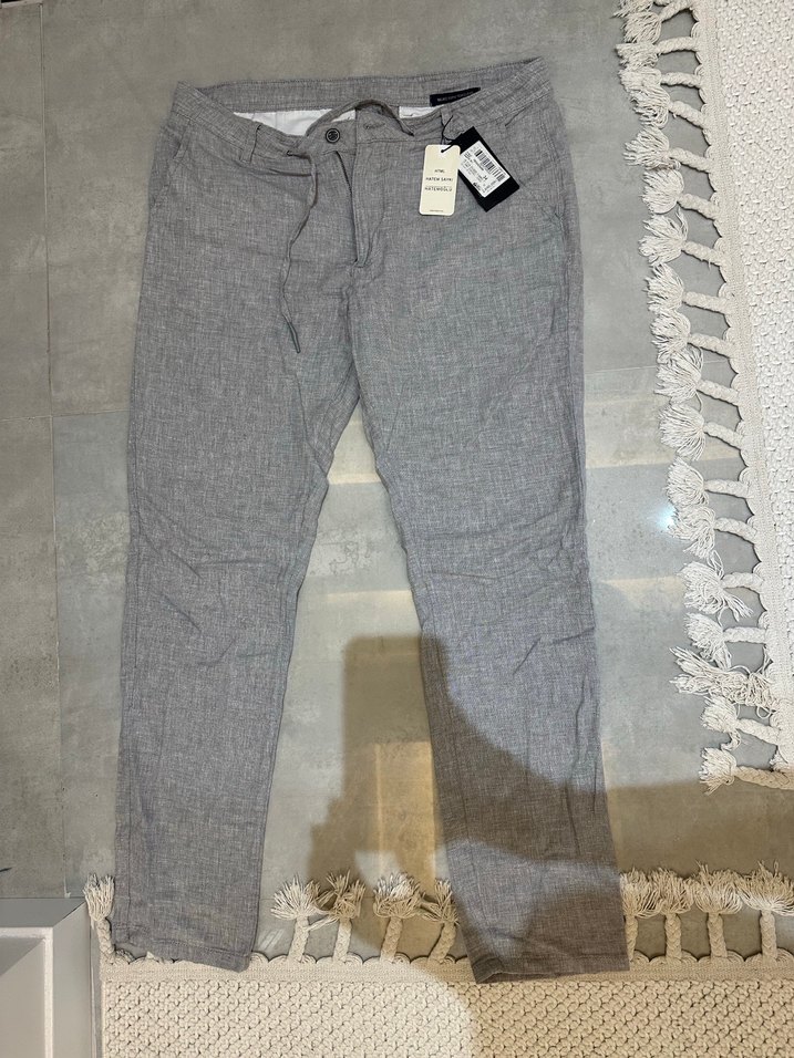 Gri keten kumaştan yapılmış, düğmeli ve rahat kesim erkek pantolonu. Günlük sokak stiline uygun midi boyda, desensiz tasarım.