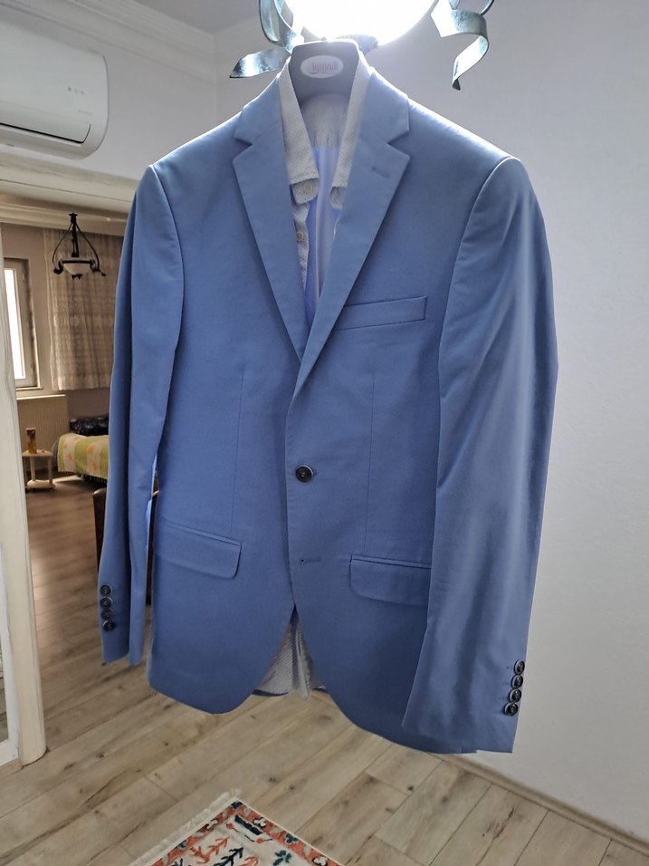 Mavi parlak renkli, düğmeli, klasik yakalı ve normal kesim erkek takım elbisesi. Uzun kollu ve iş ortamları için uygundur.